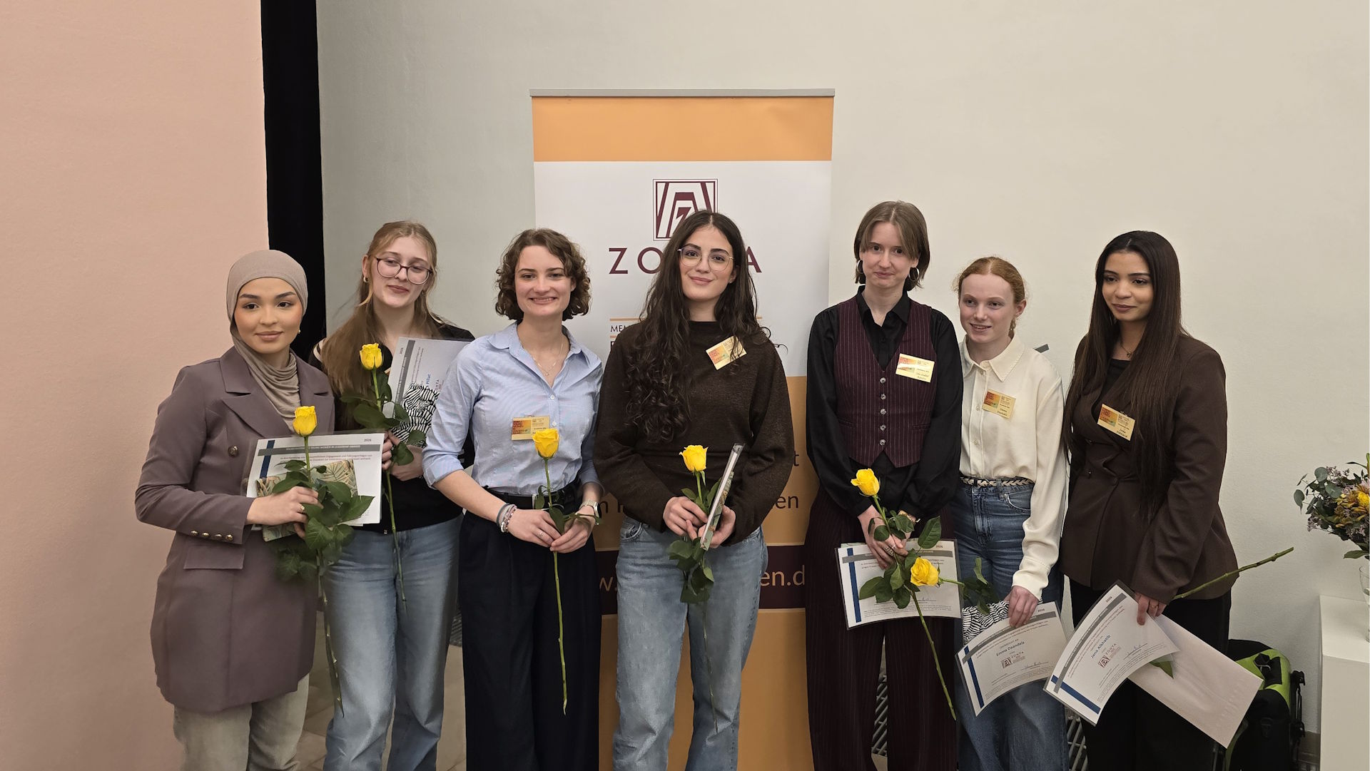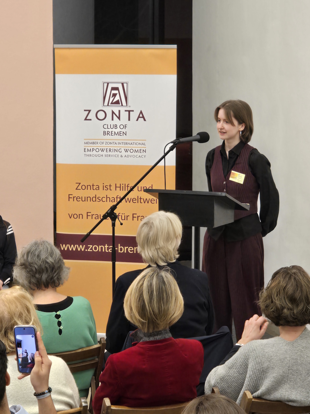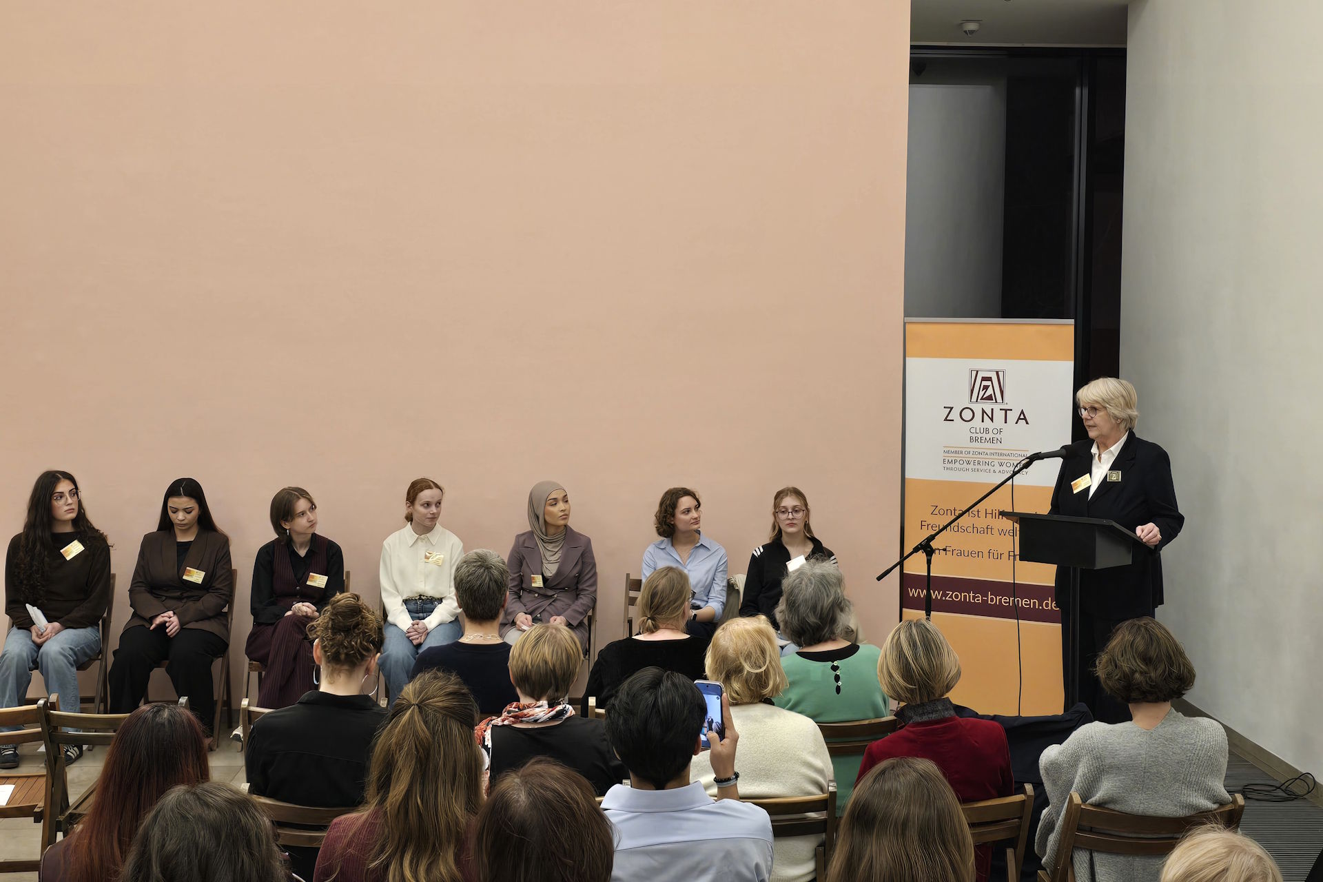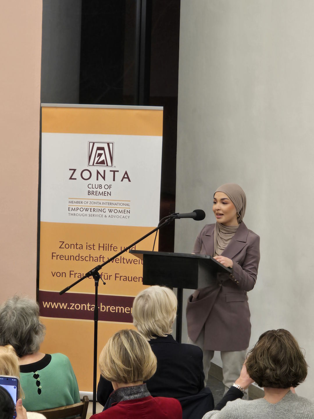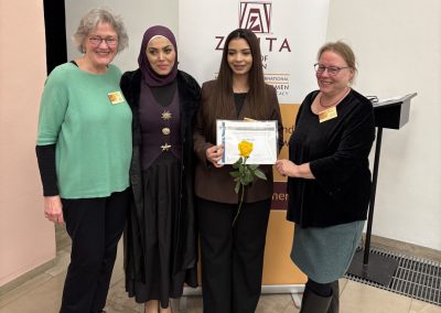 In Anwesenheit der ehemaligen Frauenbeauftragten des Landes Bremen, Ulrike Hauffe, übergab Clubpräsidentin Prof. Dr. Johanna Myrzik im festlichen Ambiente des Gerhard-Marcks-Hauses am Mittwochabend, den 04. März 2026 die Urkunde für den „Zonta Young Women in Leadership Award“ 2026 an die 18-jährige Schülerin des Hermann-Böse-Gymnasiums Jana Alkhatib.